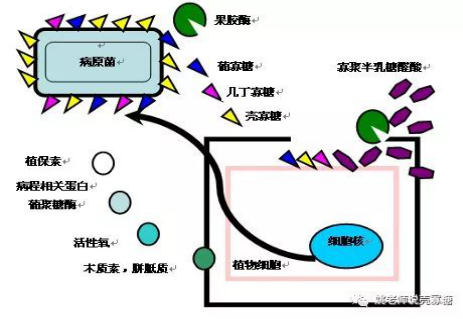殼寡糖能有效的防治作物病害,主要通過兩個途徑起作用,一是殼寡糖可以抑制植物病原菌生長,減弱病原物的侵染能力。二是殼寡糖與植物細胞上的受體結合,激發抗性信號分子產生如NO、H2O2、Ca2+、茉莉酸等,經過信號轉導,激發抗性基因表達,產生抗性物質如β-1.3葡聚糖酶、幾丁質酶、植物抗毒素、苯丙氨酸解氨酶、過氧化物酶、多酚氧化酶、過氧化氫酶、超氧化物歧化酶等,從而達到防治病害的目的。殼寡糖促進植物生長主要是由于誘導了生長素IAA的合成,生長素信號傳入植物體內起生長調節作用,激活植物多種生長發育基因表達,合成利于植物生長的生物活性物質,最終促進了植物的生長發育。